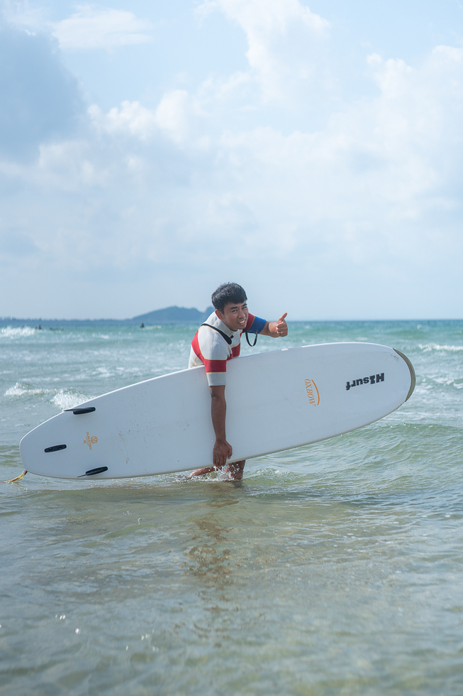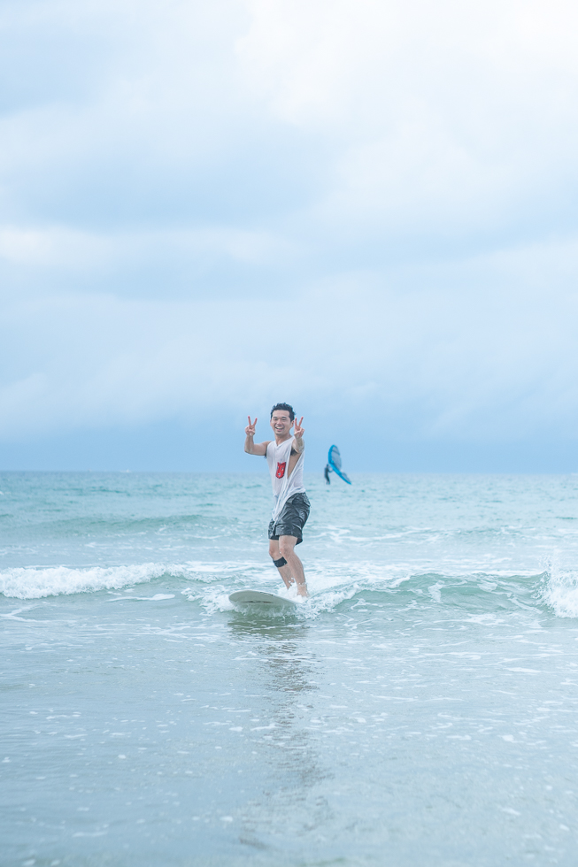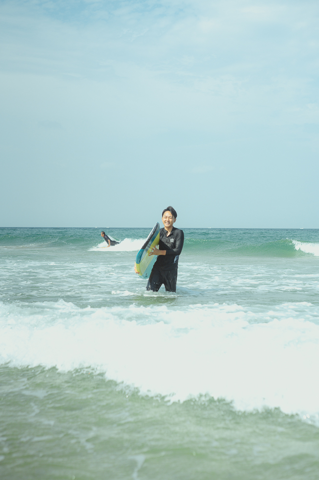 何度も波にチャレンジしては、乗った瞬間にバランスを崩してドボンといったり、うまく波に乗って浜辺近くまですすんだり。