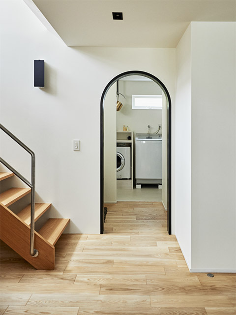 キッチンの裏側に造作洗面。