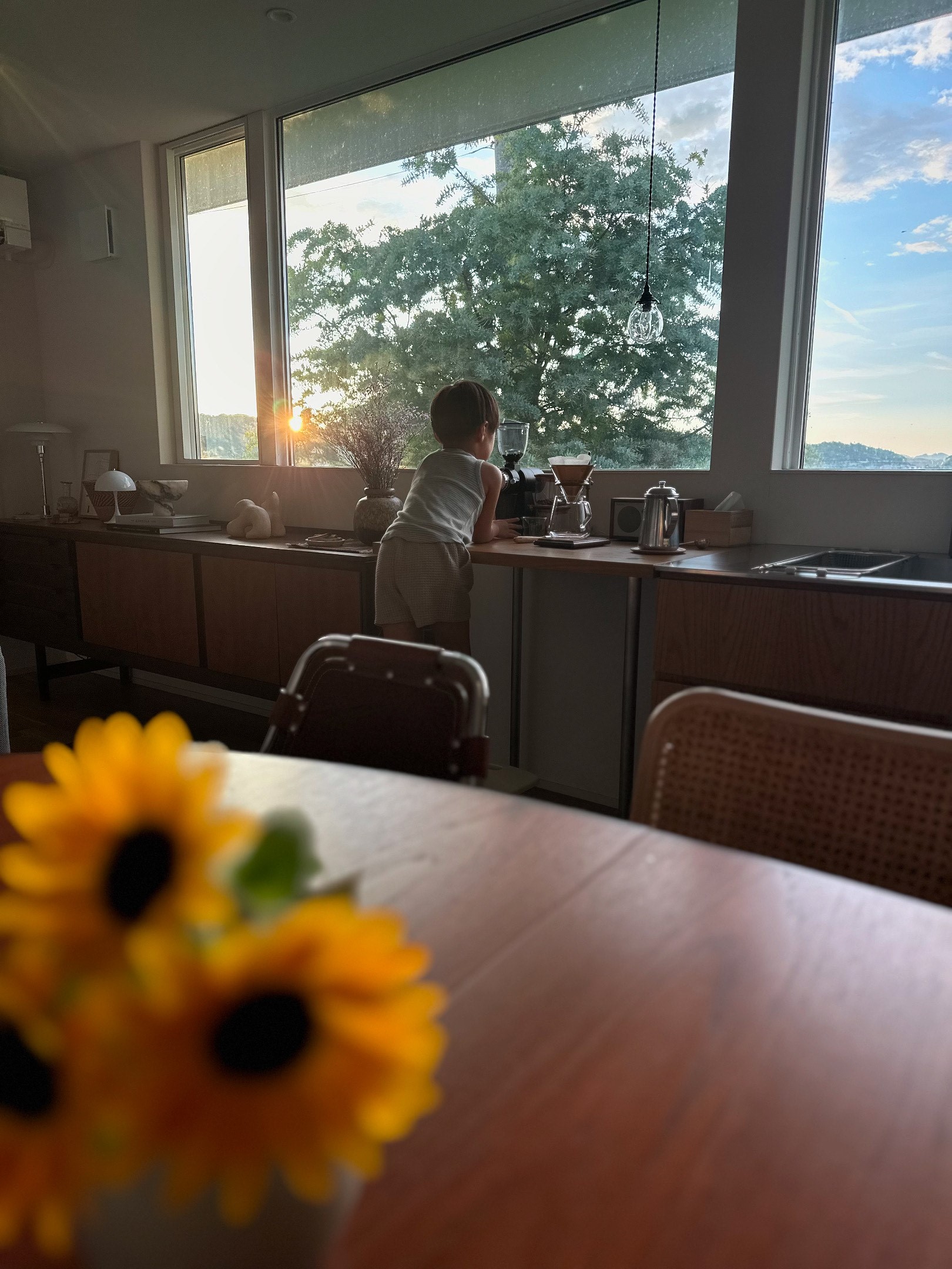 ワイドな窓から入る光がやわらかく、そこからの景色はどんな景色なんだろう、小さなバリスタさんが淹れてくれるコーヒーは一体どんな味なんだろう・・と、想像するのが楽しいです。心地よい暮らしをされているのが伝わる作品だと感じます。