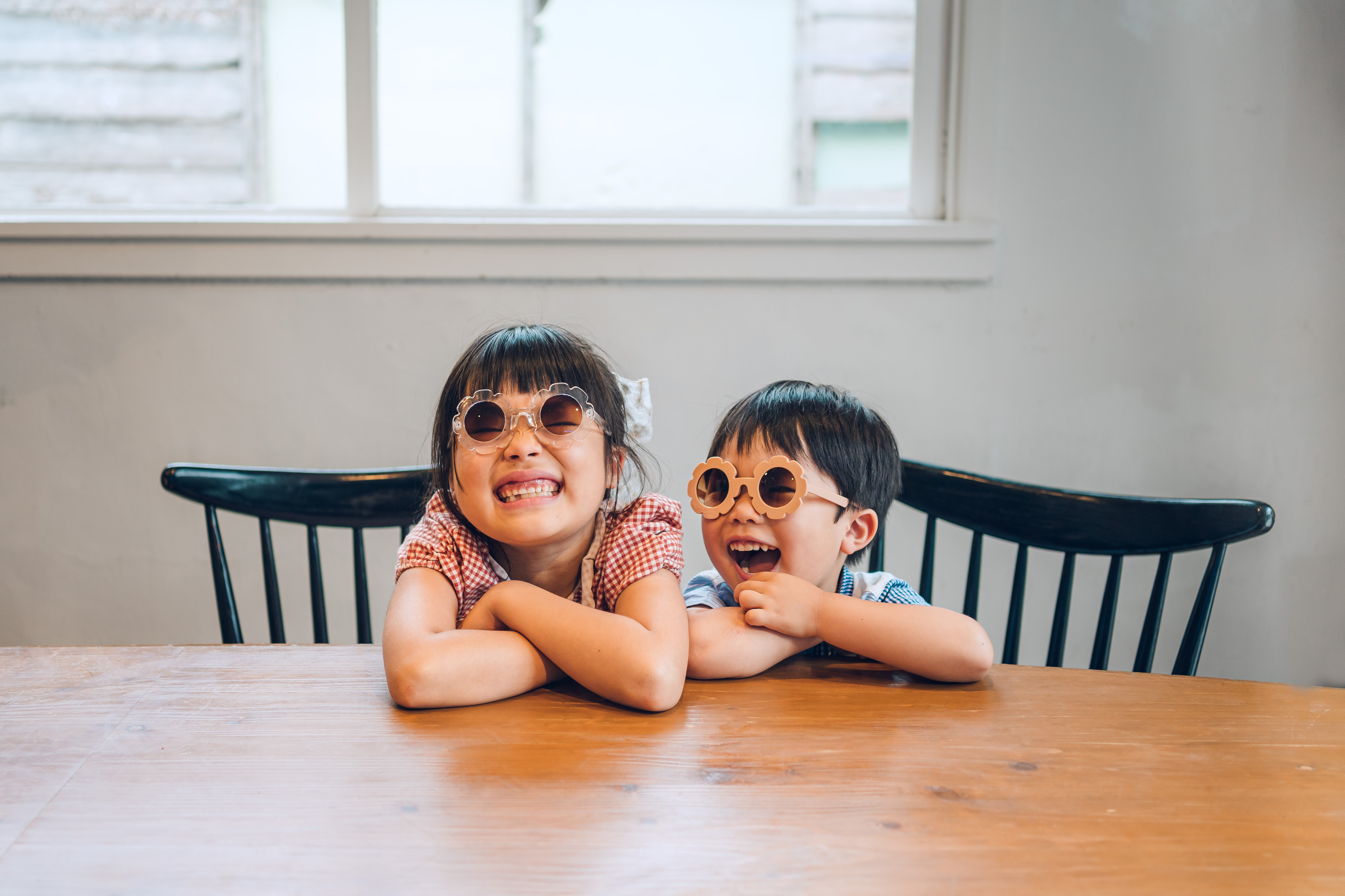 お揃いのサングラスをかけて、笑顔と元気な表情が写真全体に温かさを感じさせてくれます。