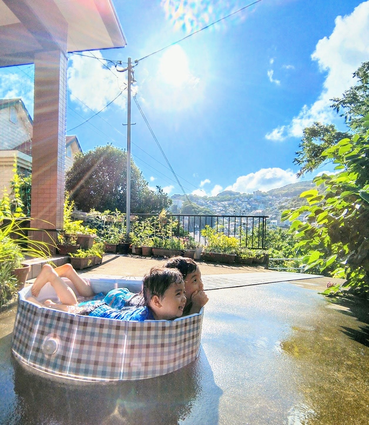 夏の青空の下、ふたり仲良く水遊びを楽しむ様子が見る人を自然と笑顔にしてくれる1枚だと感じました。